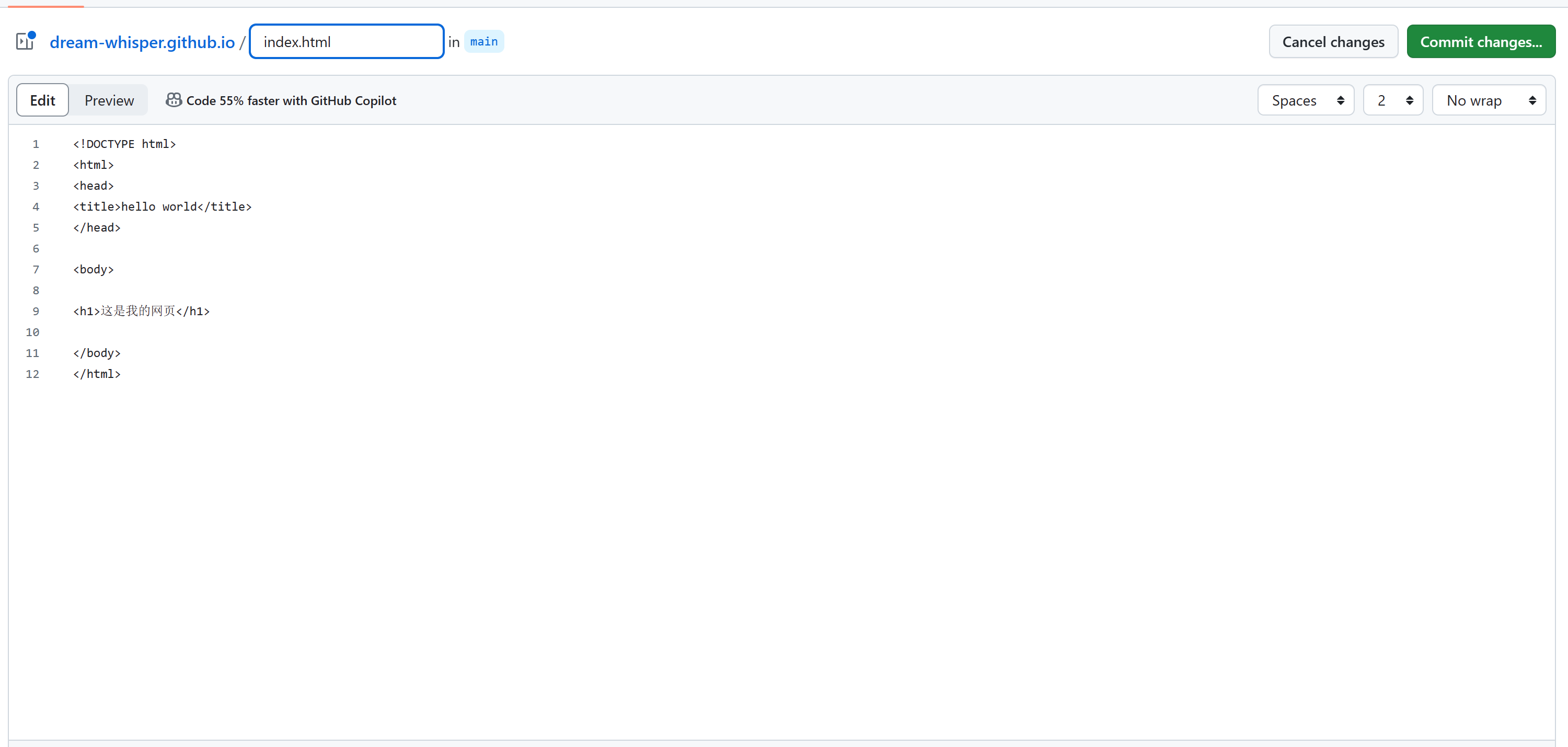 其中文件名必为”index.html”,最后点击两次”commit change”保存修改