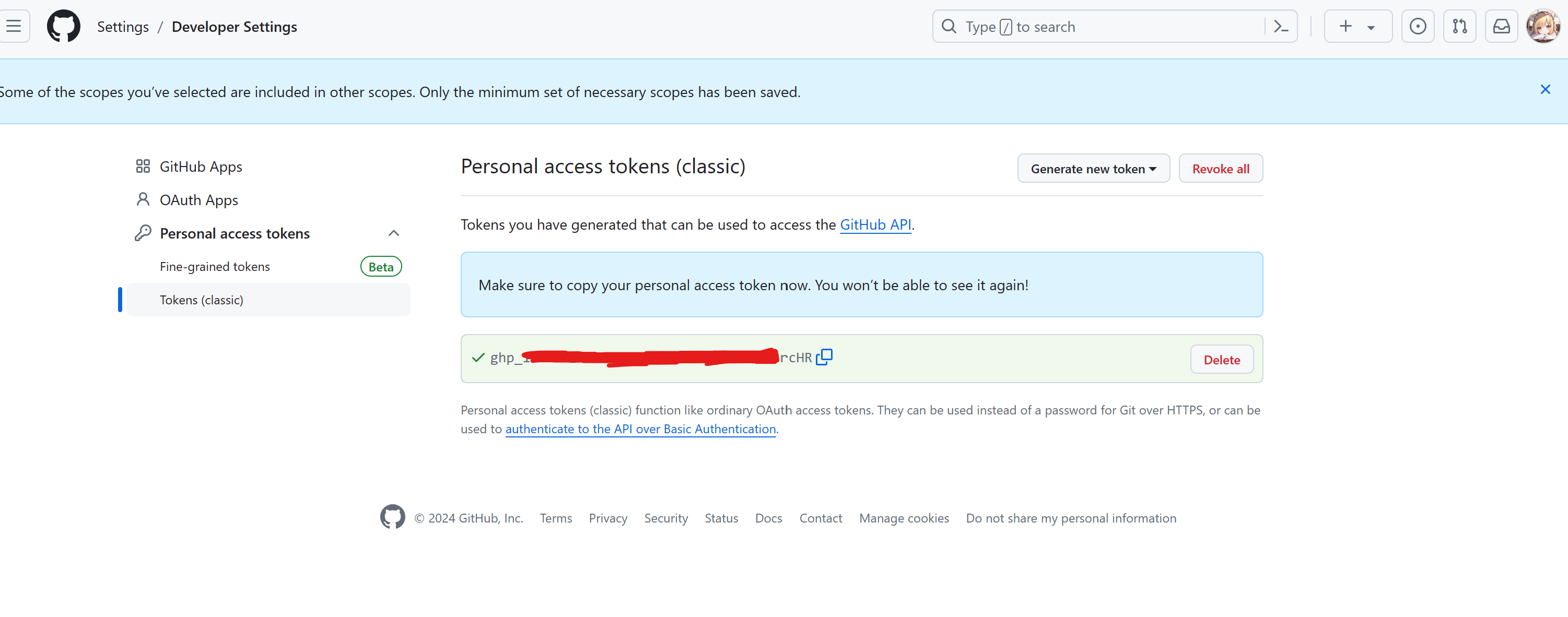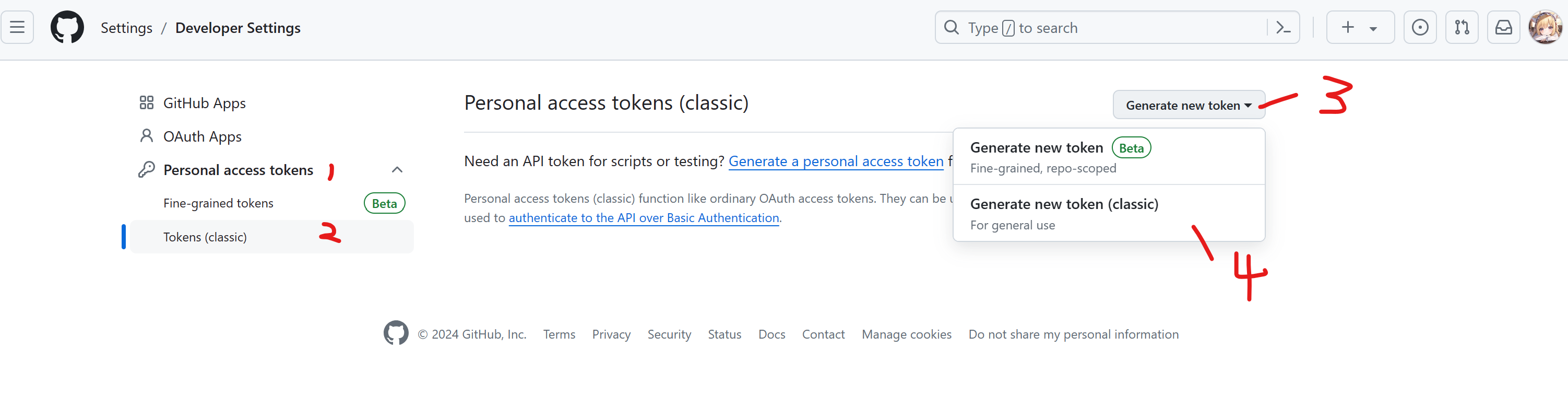 选择1.”Personal access tokens” 2.”Tokens(classic)” 3.Generate new token 4.class的选项